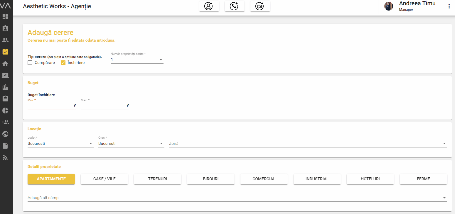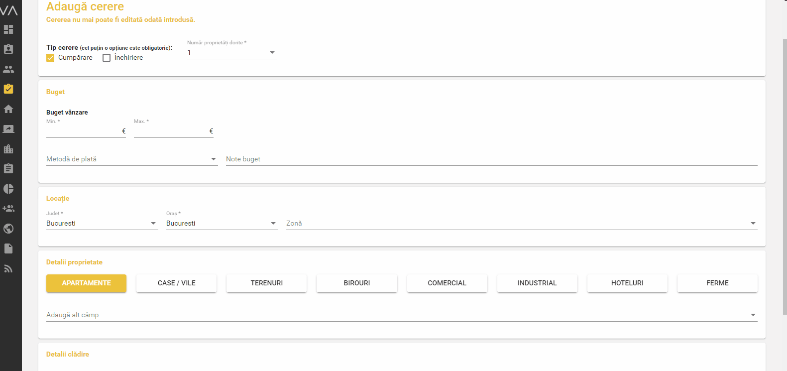 În secțiunea de adăugare cerere, poți să adaugi bugetul lead-ului tău, locația, dar și detaliile proprietății și observații, precum în modelul de mai jos.