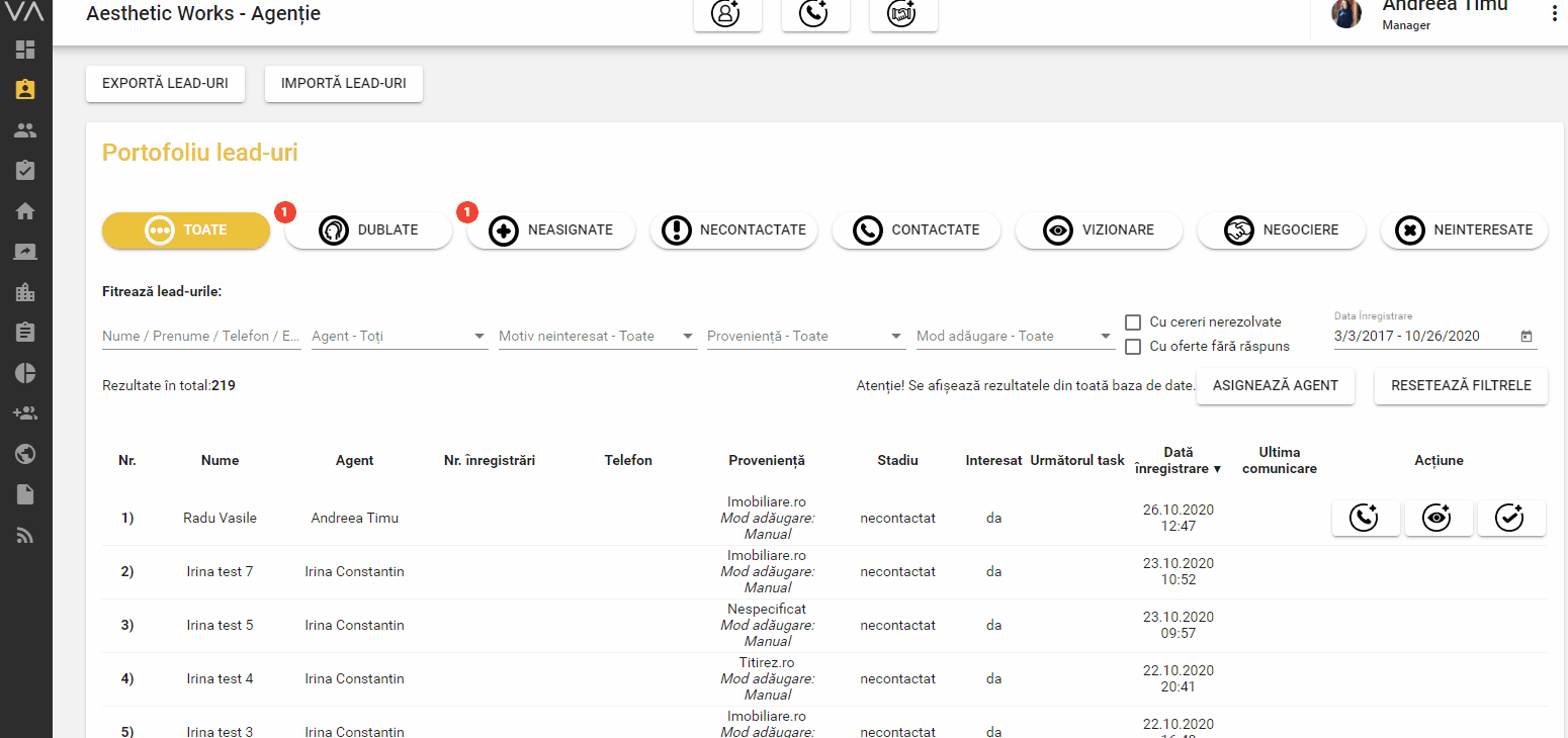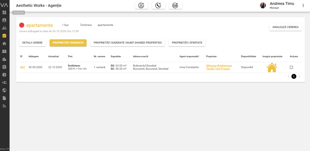 Mai apoi, în secțiunea proprietăți sugerate, vei avea acces la toate ofertele de proprietăți care se încadrează în cererea lead-ului tău. Ofertele de proprietăți provin atât din portofoliul tău de proprietăți, cât și al companiei. De asemenea, ai la dispoziție și proprietățile sugerate prin categoria VAUNT – Share Properties, din care poți oferta. Nu în ultimul rând, categoria de proprietăți ofertate îți pune la dispoziție proprietățile pe care le-a văzut lead-ul tău, cu un feedback. (mai multe despre proprietățile ofertate, aici)