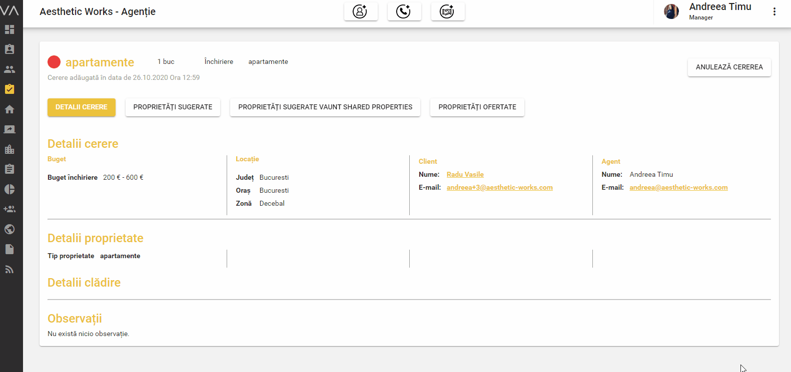 Home Documentație Cereri Cum anulezi o cerere? Totodată, în secțiunea Cereri, ai și posibilitatea de a anula o cerere. Urmărește modelul de mai jos: Previous Cum validezi o cerere? Next Ce găsești în Dashboard?