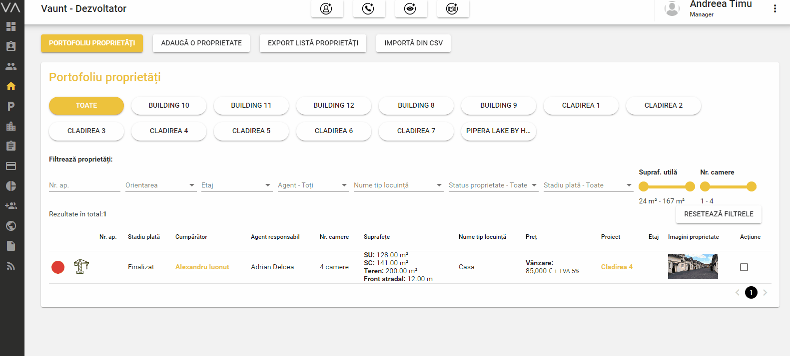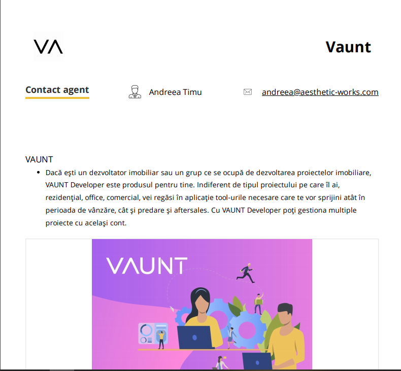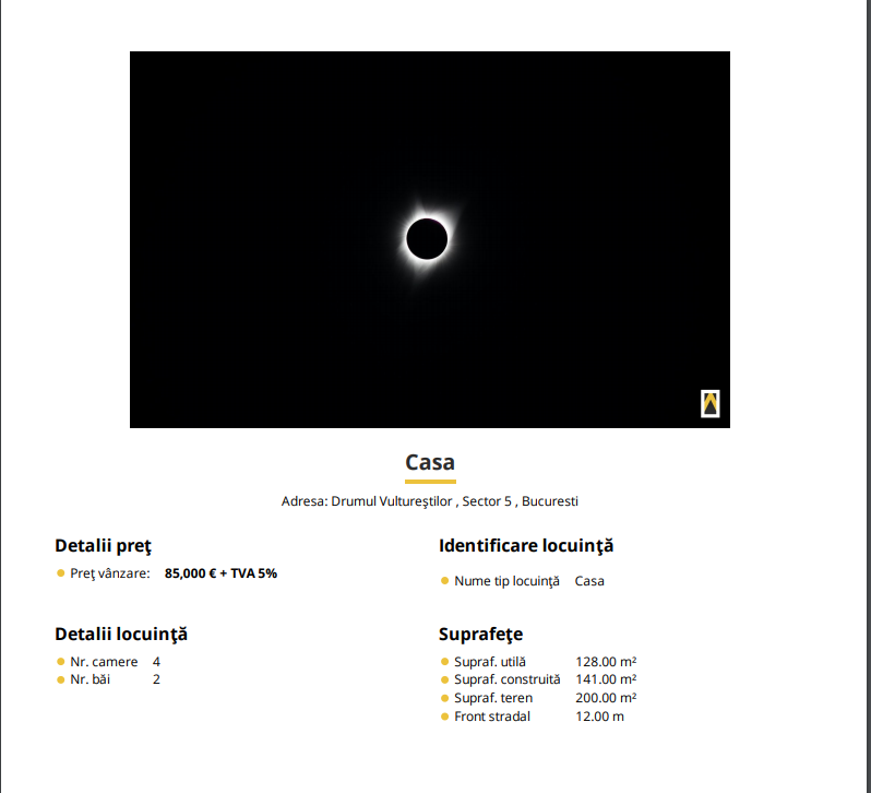 Prezentarea proprietății poate să fie descărcată pdf, trimisă pe WhatsApp, copiată sau trimisă pe mail. Așa cum putem vedea în modelul de mai jos, aceasta conține descrierea adăugată anterior de noi, alături de alte detalii relevante pentru prezentarea proprietății care sunt inserate automat în crearea prezentării.