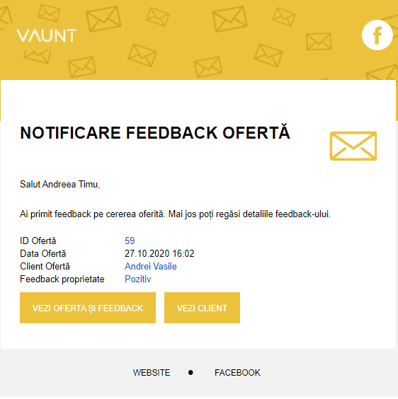 Odată creată oferta, aceasta poate fi descărcată PDF, copiată sau trimisă prin mail clientului tău. Mai apoi, prin mail (ex.1) vei fi notificat în cazul în care acesta oferă un feedback pozitiv sau negativ proprietății, precum poți vedea în „ofertare3”.