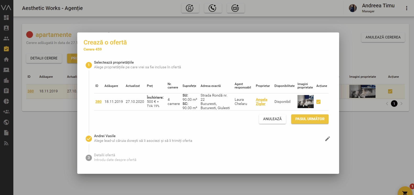 Pentru a realiza o ofertare, poți să accesezi cererile, apoi selectezi în dreapta acțiunea pe una sau mai multe proprietăți sugerate. În secțiunea ofertării, selectezi proprietatea, iar mai apoi selectezi lead-ul căruia dorești să îi fie adresată oferta.